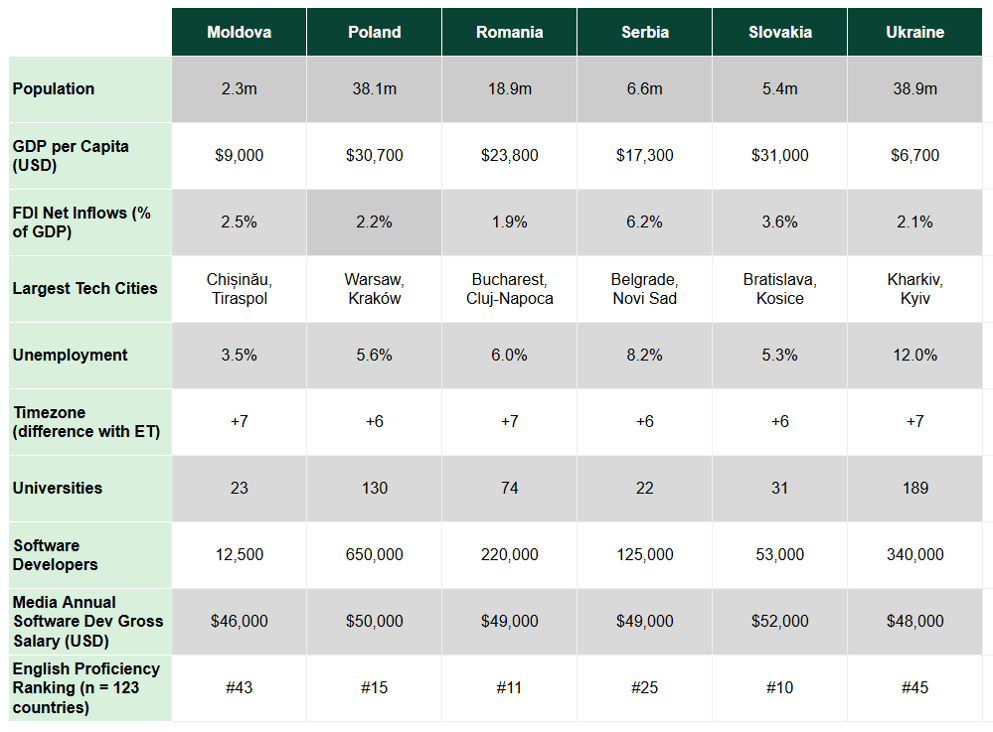 As with any regional benchmarking, individual sources may report different values across categories. These figures are intended to offer a directional perspective on Central and Eastern Europe's ongoing development as a software and technology services region.