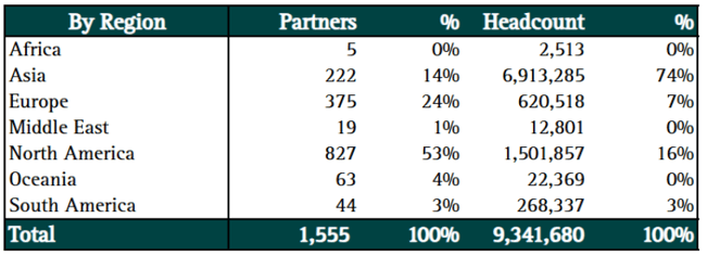 More than half of ServiceNow’s services partners are based in North America, while most of the global delivery workforce is concentrated in Asia, consistent with the typical structure of technology services organizations.