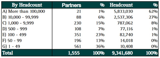 More than one-third of ServiceNow’s partner ecosystem consists of firms with fewer than 50 employees, and almost half of consulting firms are small with fewer than 100 team members, showing continued fragmentation in this ecosystem.