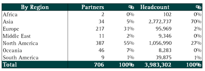 After cleaning the data, we identified 706 Stripe services and consulting partners worldwide. Their regional distribution is shown below: