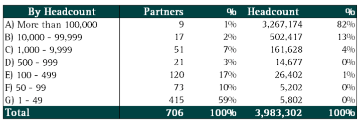 The distribution of Stripe services partners by firm size is shown below.