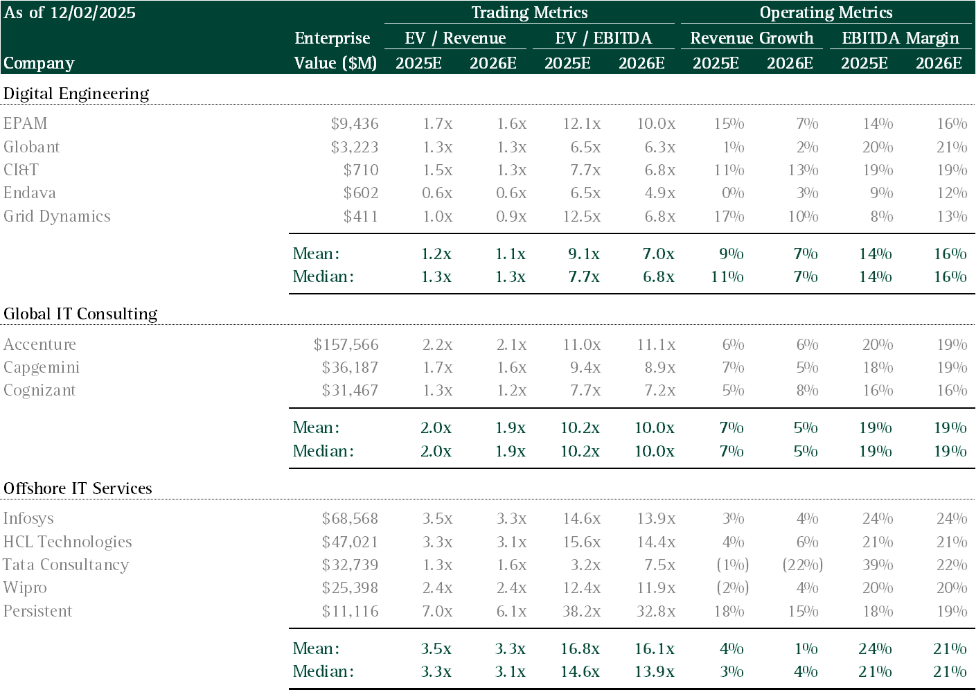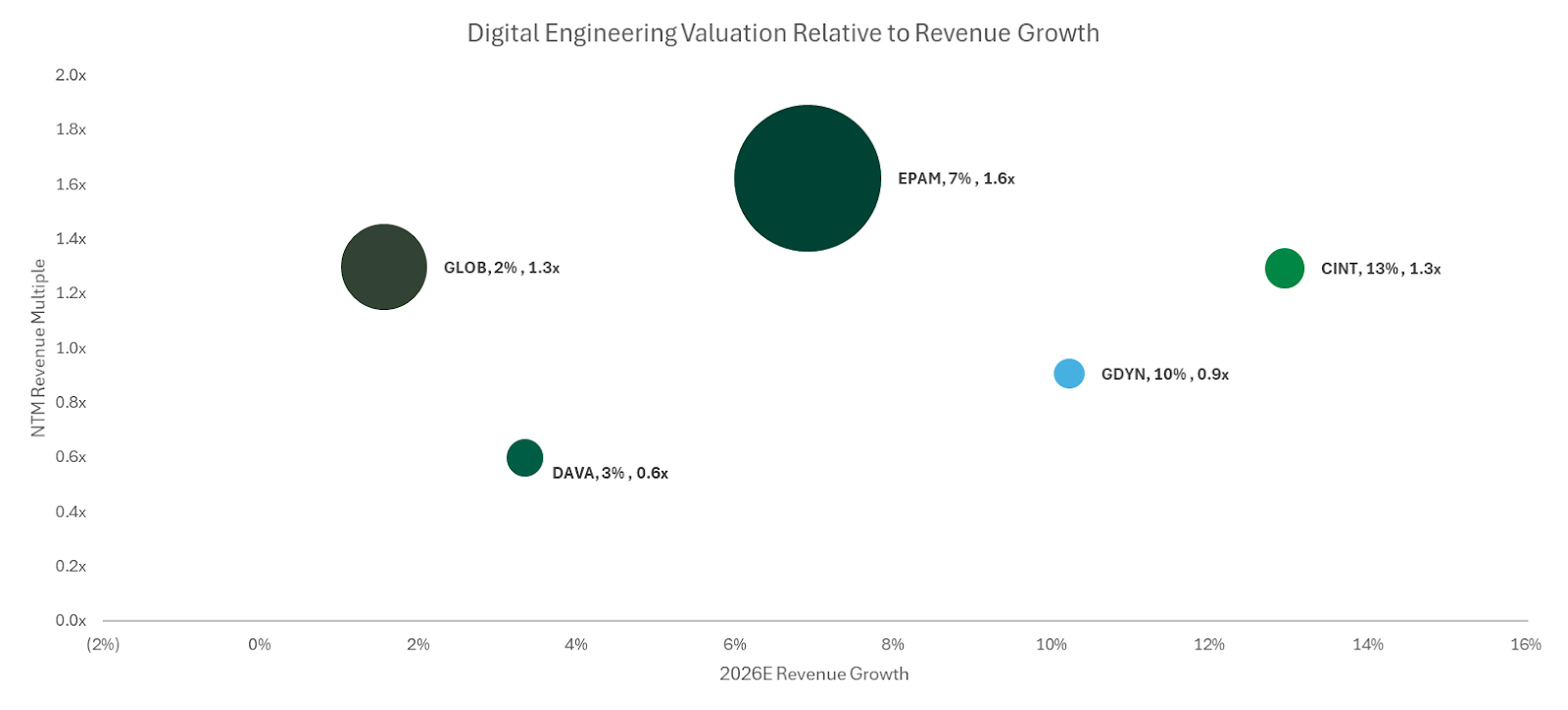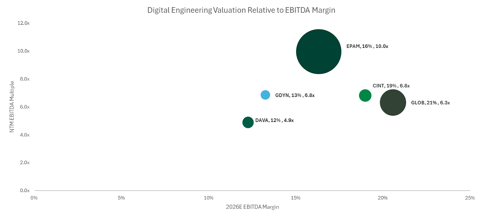 CI&T is expected to grow the fastest in 2026 (13%). EPAM has the highest revenue multiples among the group.