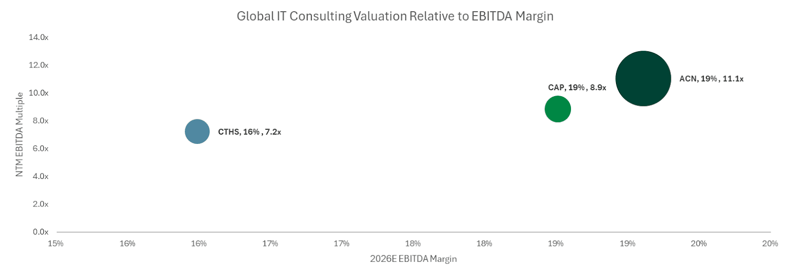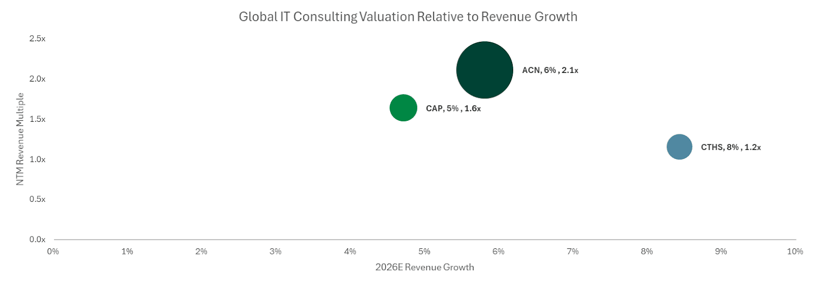 Cognizant is expected to grow the fastest in 2026 (8%). Accenture has the highest revenue multiples among its peers.